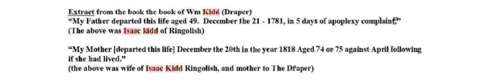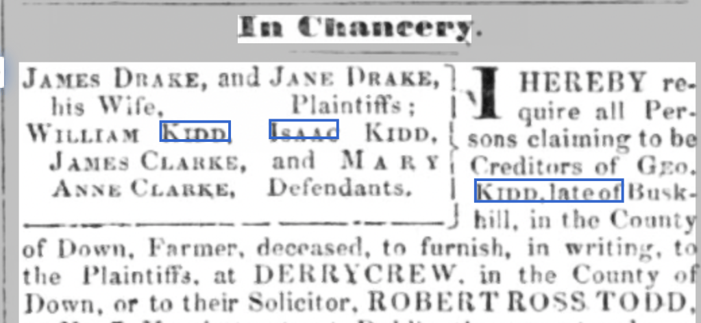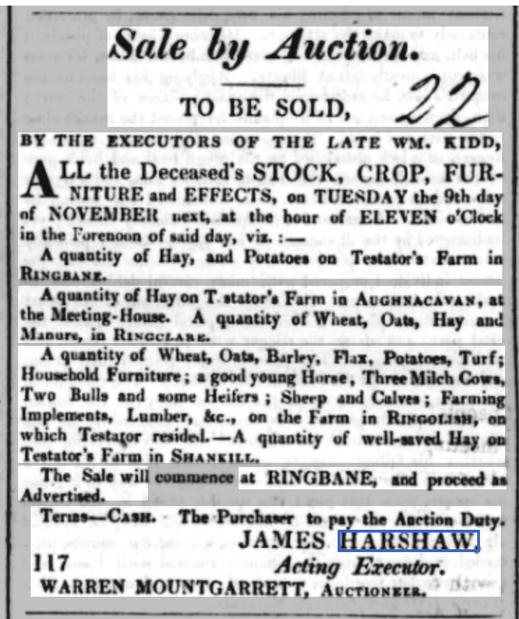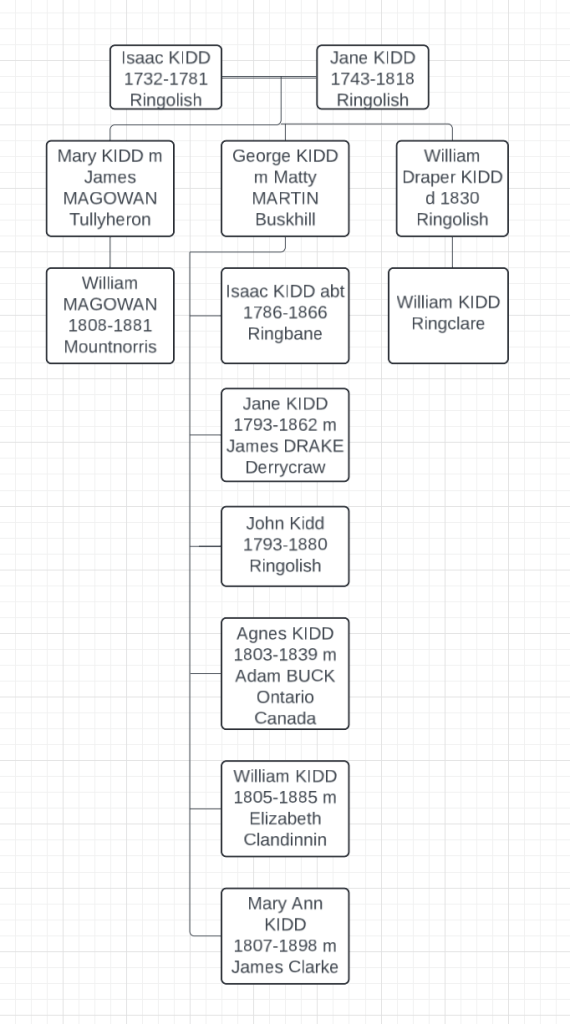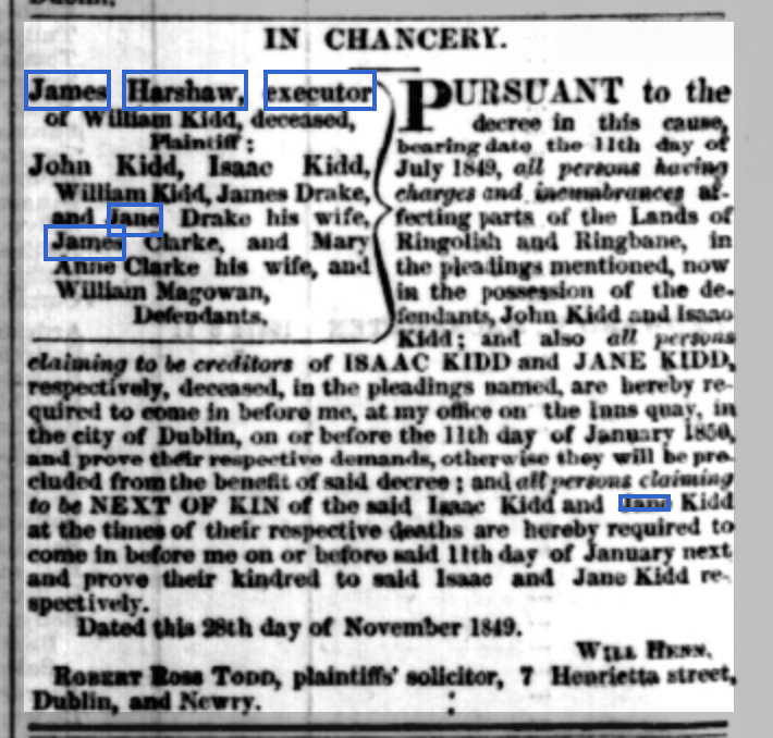 - Thirdly, what happened to the other William Kidd, Draper Kidd’s son in this deed? This William Kidd (of Ringclare) and William Magowan were the ones who met at the lawyer’s office mentioned in James Harshaw’s notes in June 1860. They directed that the estate to the value of £920 be wound up. However, this deed of July 1850 only relates to the Ringolish farm which sold for £ 720. Did Draper Kidd’s son, William Kidd get the value of the Ringbane farm, the other £200?