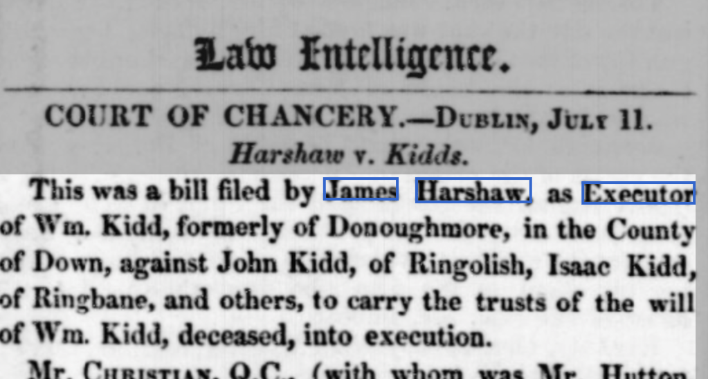 In earlier posts we have looked at a variety of sources related to the Kidd family. These documents include a surviving will. There are also family letters and newspaper entries. Additionally, there are the diaries of James Harshaw, who was the executor of the will. In this post I want to highlight another important source for 18th and early 19th century, The Registry of Deeds in Dublin. In its records there is another document that highlights what happened to one of the Kidd family farms after the court case.