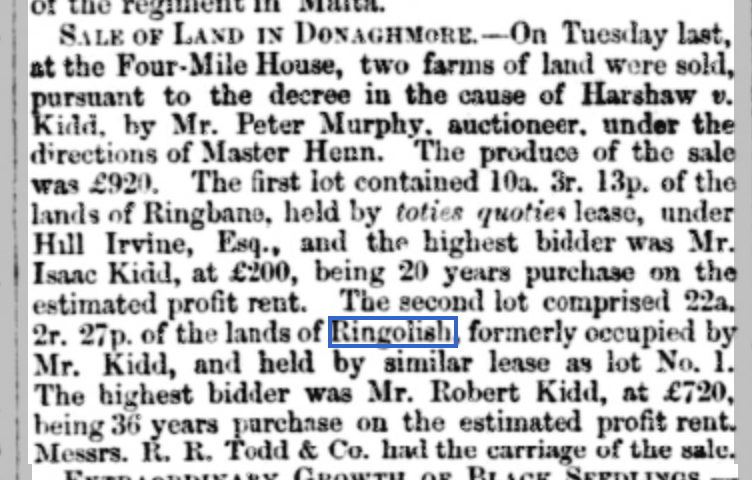 - Secondly, the deed says that John Kidd was late of Ringolish. This does not mean he was deceased, but rather that he was no longer living there. Through Isaac Kidd’s will in PRONI, I have been able to show that several of Isaac’s children were living in County Tyrone, while others were still in Donaghmore at the time of his death in 1866. But I have no information on John Kidd’s descendants. This is strange in that, as I also mentioned in a previous post, the same parcel of land in Ringolish occupied by John Kidd in 1854, 22 statute acres and change, that is further mentioned in this deed of 1860, is still occupied by a John Kidd in the 1864 Griffiths valuation.