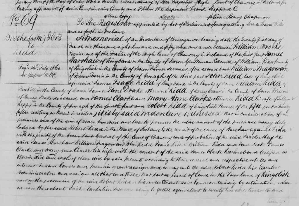 The point of entry to this transaction, if it was recorded, would be the name of the executor of the will, James Harshaw. And sure enough, there was a deed registered on 16th July 1860 with James Harshaw in his role as executor, in company with William Brooke, one of the Masters of the High Court of Chancery in Ireland, and William McGowan of Mountnorris, Co. Armagh, and with John Kidd late of Ringolish, Isaac Kidd of Ringbane, William Kidd of Buskhill, Jane Drake otherwise Kidd of Derrycraw, and Mary Ann Clarke otherwise Kidd of Tullyhappy, making over the lease of the Ringolish farm to Robert Kidd of Ringolish.